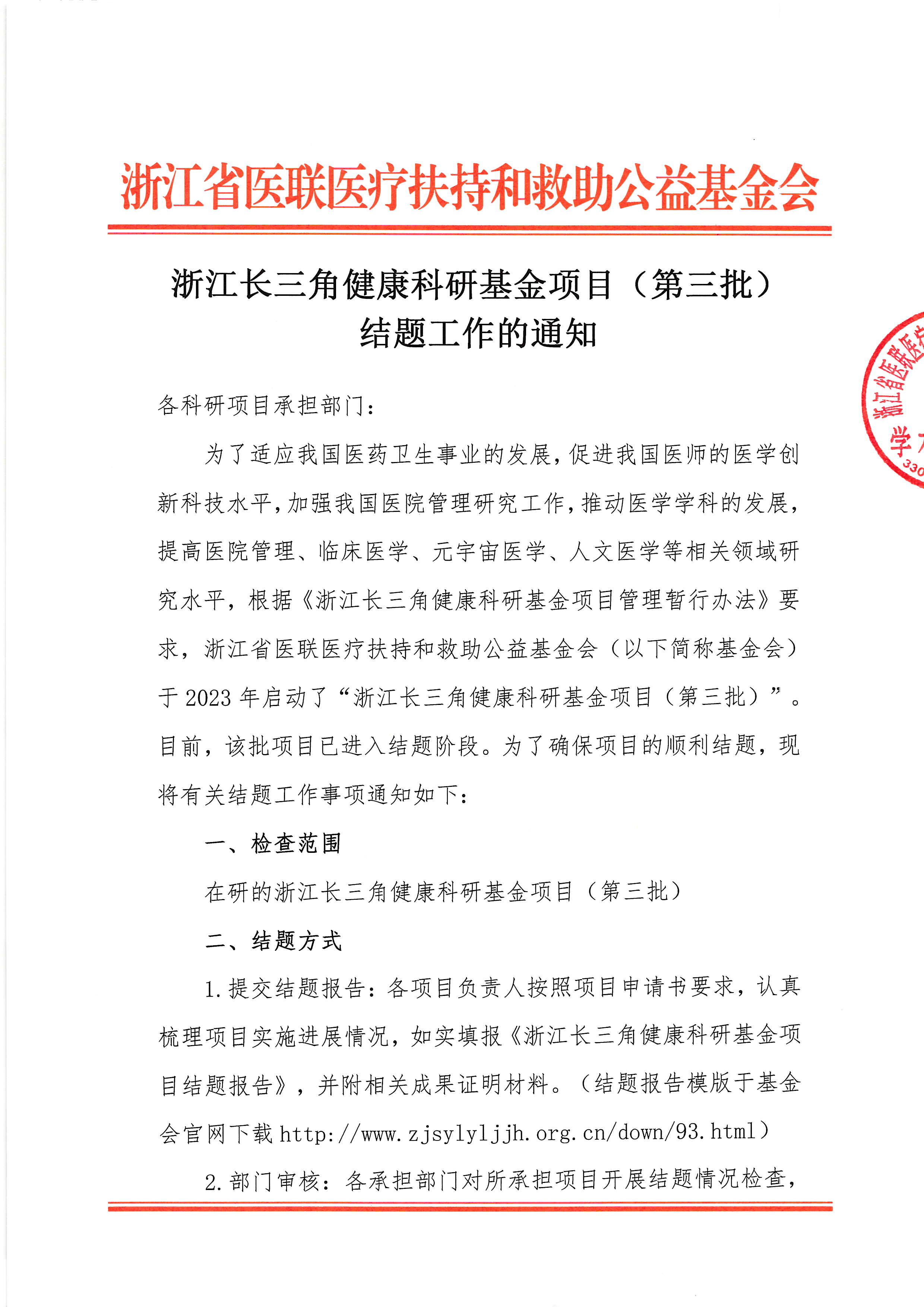 浙江长三角健康科研基金项目(第三批)结题工作的通知